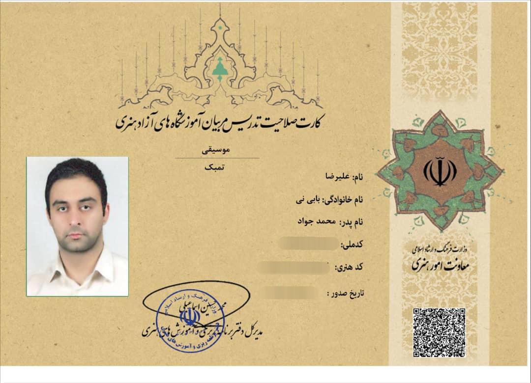 دارای کارت صلاحیت تدریس از وزارت فرهنگ و ارشاد اسلامی .